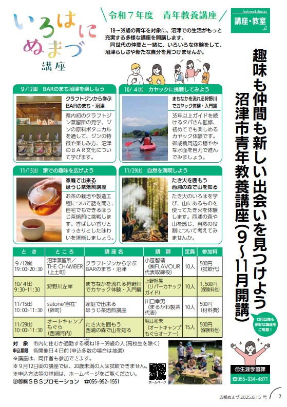 広報ぬまづ9月1日号に掲載されていたのは、9月からスタートする4つの講座ですが、8月22日に本町にあるリバーブックスで開催される本の楽しみ方講座を皮切りに全部で10の講座があるようです(リバーブックスの講座は18日締め切りみたい)。