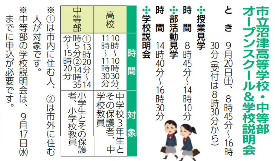 全国の大学も夏休み期間はオープンキャンパスなどを積極的に開催していますよね。9月に入ると、沼津市内のいろんな高校でもオープンスクールが予定されているようです。まずは広報ぬまづにも載っていた、沼津市立高校。しりつこー&中等部のオープンスクール&学校説明会。