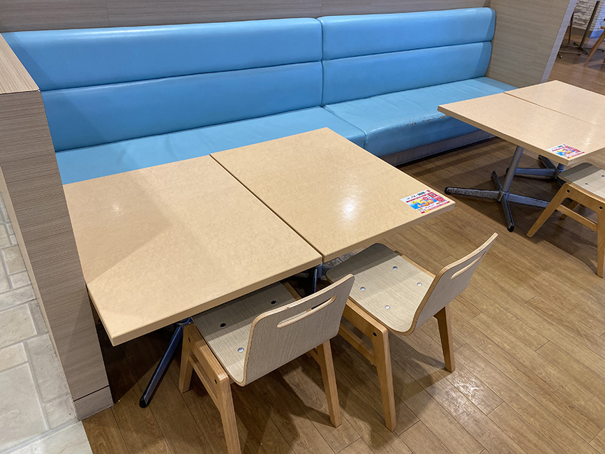 ちょっとだけ椅子の低い、キッズのいる家庭向けのテーブルには貼られてなかったな。