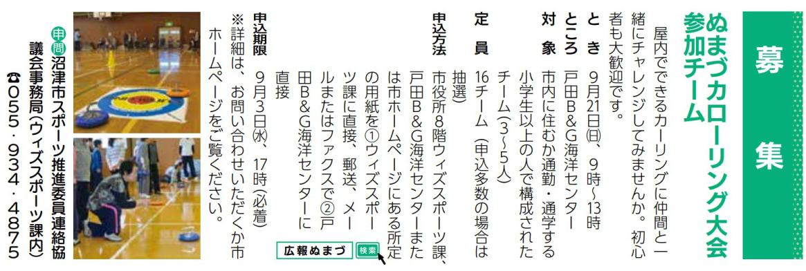 そんなカローリングをみんなでワイワイ楽しめるのが、毎年戸田で開かれる「ぬまづカローリング大会」。最大16チームでガチ勝負!です。開催概要は以下のとおりとなっています。