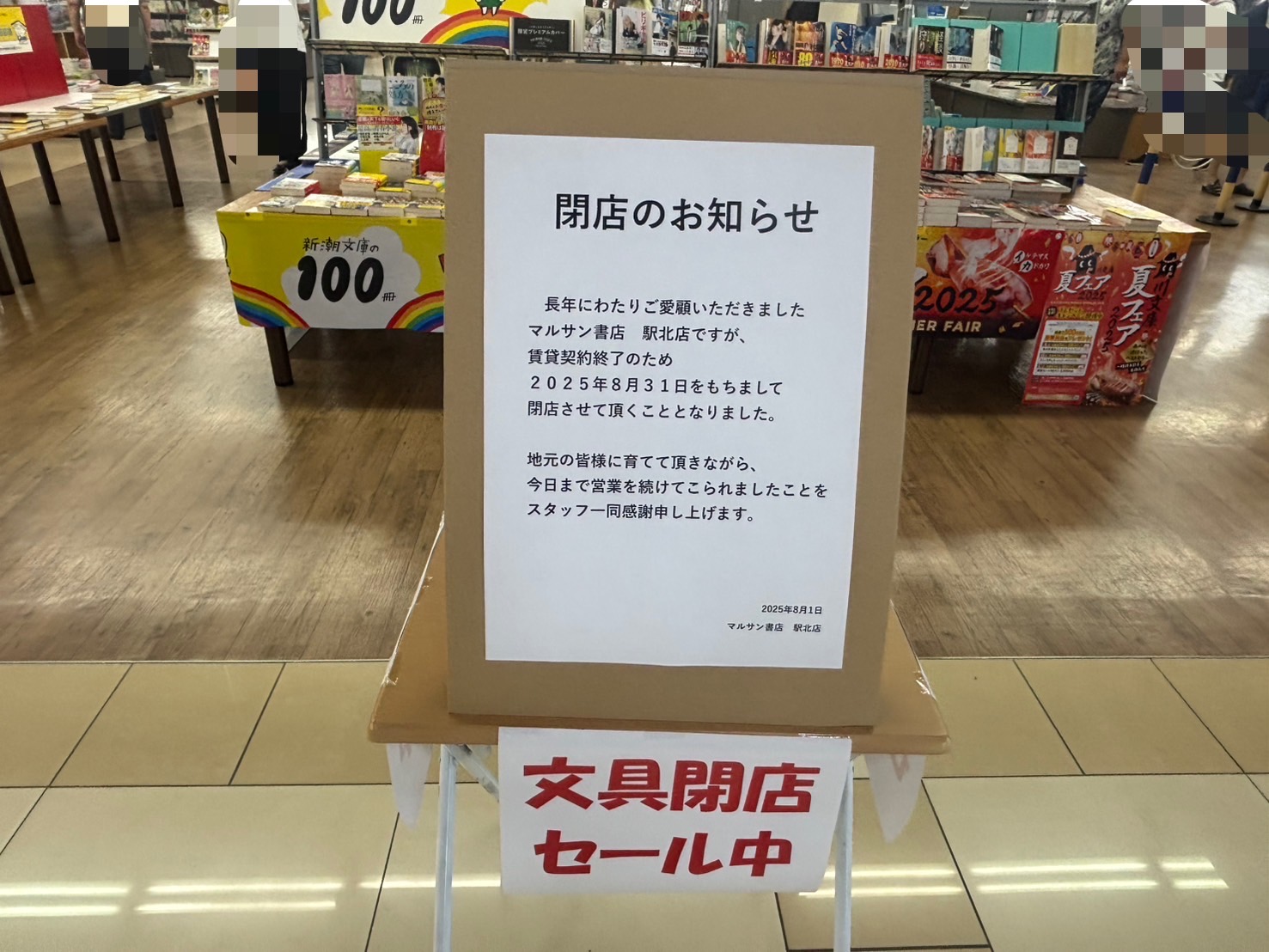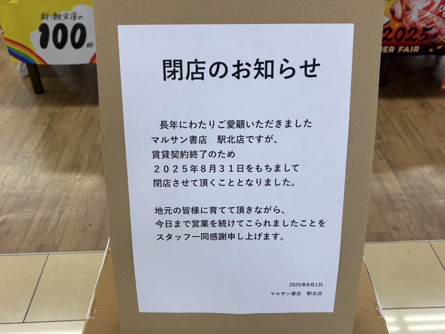 マルサン書店駅北店。長い間、ありがとうございました。そう言えば、エスポットの近くにケーキ屋さん?と一緒になってるMARUSAN × B house Cakeってところが最近オープンしたみたい。行かなきゃ。