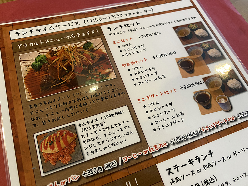 オムライスと心に決めていましたが念の為メニューを見るとどれも美味しそうだなー。迷っちゃうなー。魚・肉料理が選べる本日のランチにステーキランチ。他には、冷製パスタもいいし、おじや!なんかもある。すごいラインナップだな。