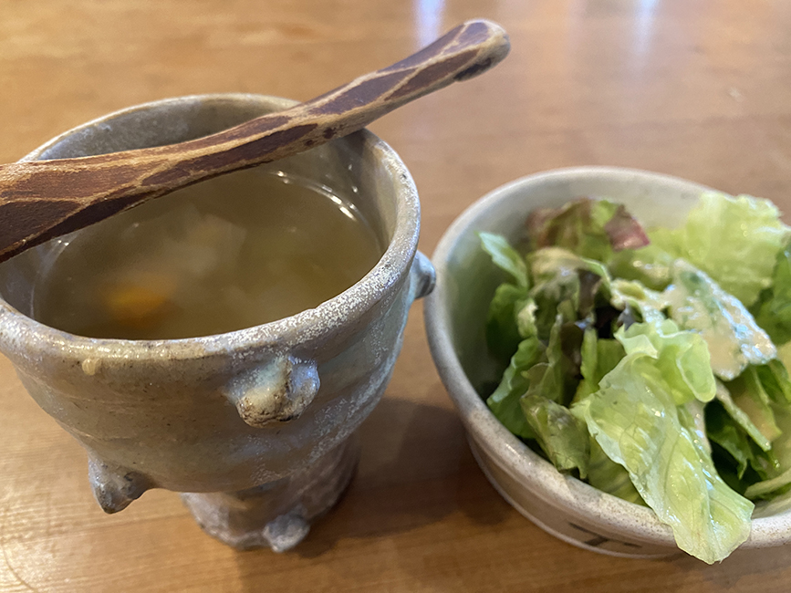 ほどなくスープとサラダがサーブされます。スープはなんかちょっと背の高い器に入ってます。なんかジブリっぽいですね。店内にもトトロのぬいぐるみとかいっぱいあるし。
