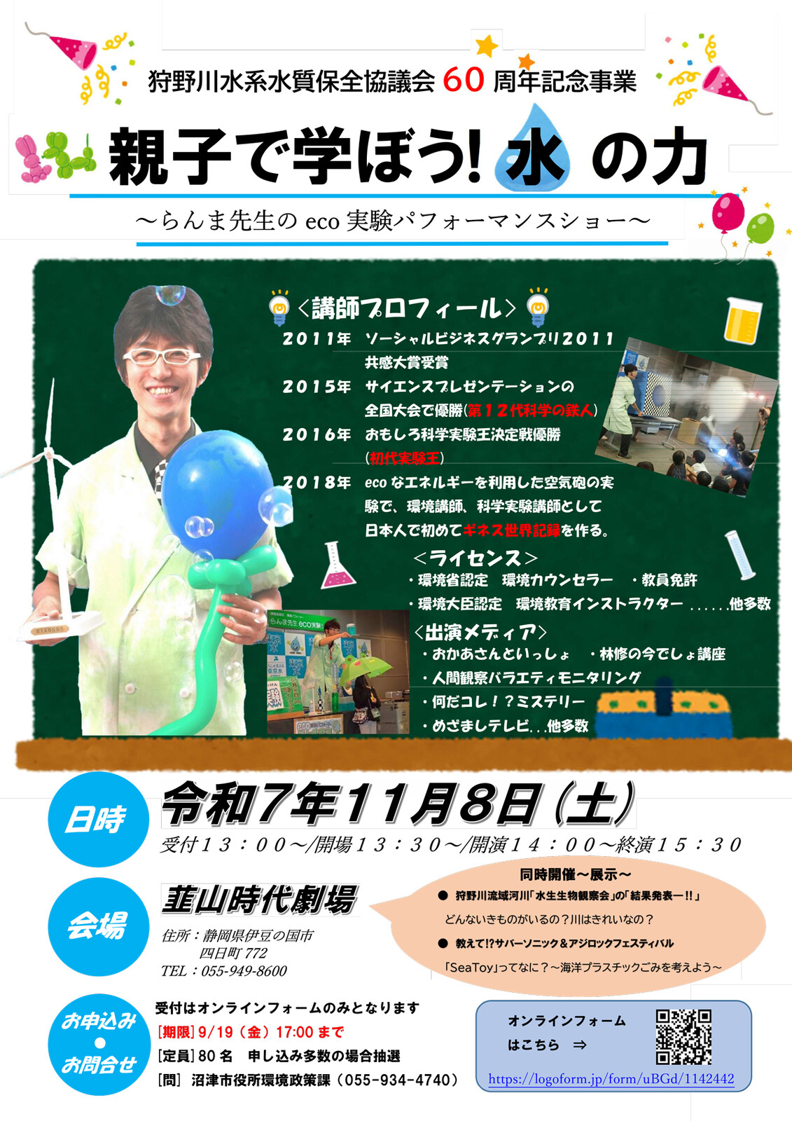 今回、この団体の60周年記念事業として、11月8日に伊豆の国市にある韮山時代劇場で「らんま先生のeco実験パフォーマンスショー(親子で学ぼう!水の力)」というイベントが開催されるそうです。