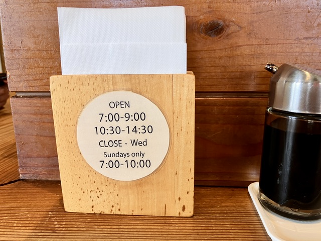 新しい営業時間は7時~9時、10時30分~14時30分。日曜は7時~10時のみ。水曜日は定休日。