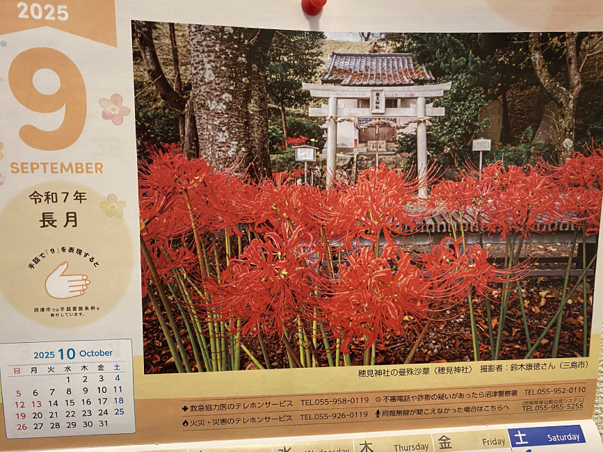 9月の市民カレンダーは三島市の鈴木さんが撮影した「穂見神社の曼珠沙華」というタイトルの真っ赤な写真が掲載されています。