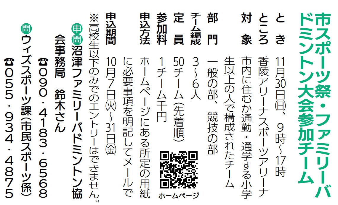 エントリー方法の詳細は沼津市ファミリーバドミントン協会のホームページをチェックしてください。また、ルールなんかも載っているので事前にチェックしてテンションあげておくといいかもしれませんね。