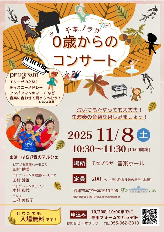 音楽の秋、赤ちゃんと一緒におでかけしたいけど、どこへ行こう?そんなときは千本プラザへどうぞ。11月8日の土曜日に、千本浜公園のちかく千本プラザの音楽ホールで0歳からのコンサートが開催されます。