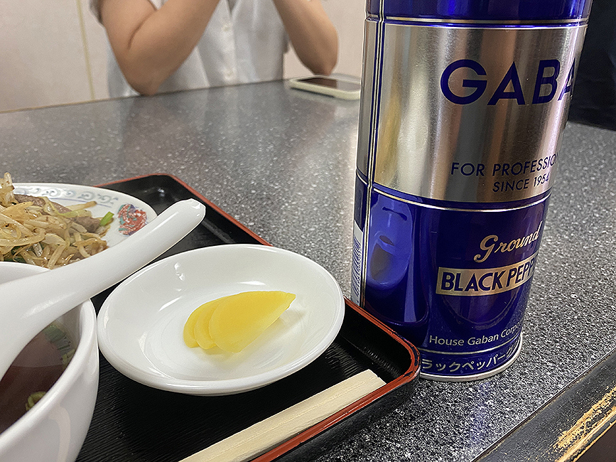 コショウが効いててスパイシーでごはんによく合う。原ひろし@ぬまつーは追いコショウでさらにスパイシーに。それにしてもGABANのテーブルコショウがでかい。