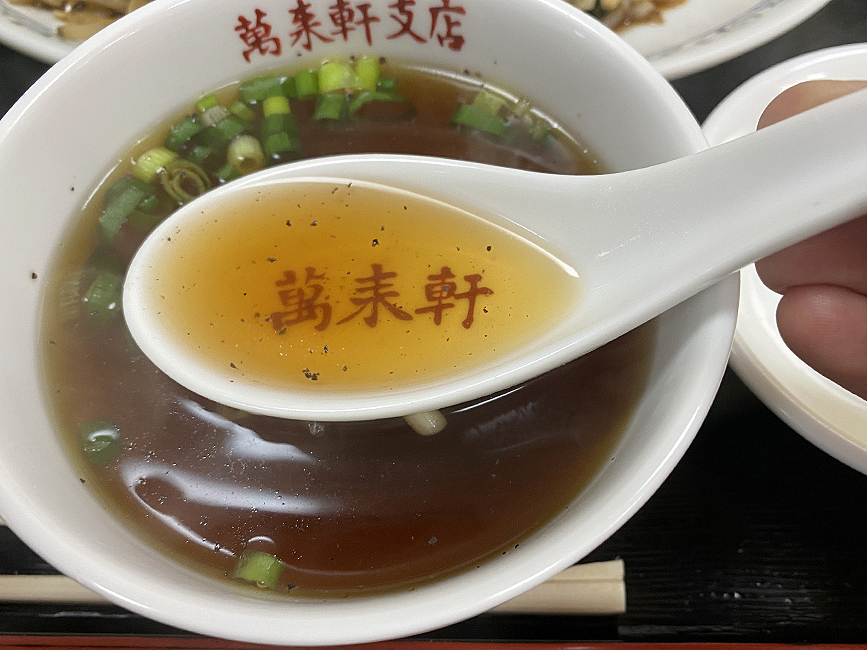 ちょっと酸味の効いたスープは透明感があってレンゲに刻まれた萬来軒の文字もばっちり。やや濃い目の味付けのレバ炒めとの相性抜群です。
