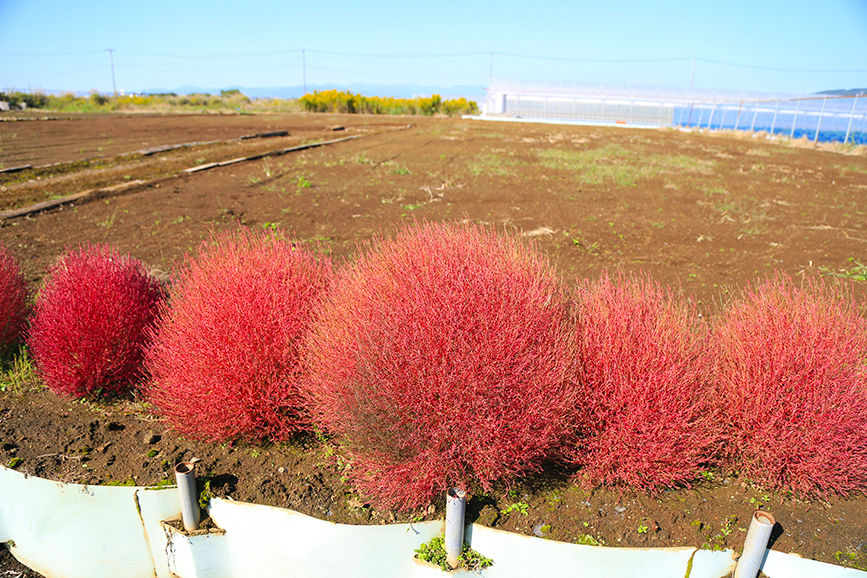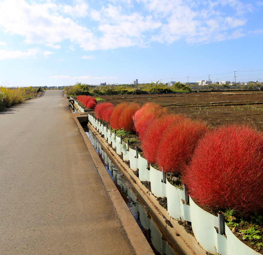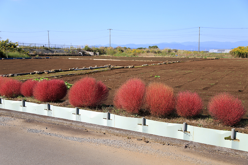 茨城県のひたちなか公園とか、山梨県の河口湖のあたりみたいにコキアの名所ってわけでもないんですがキレイに色づいていてなんか嬉しくなっちゃいますね。