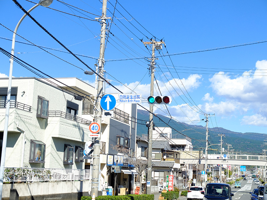駅前のパン屋さん、フランドル松屋を過ぎてちょっと北に進むと、お花屋さんのむらまつフラワーショップがあるところに白隠禅師誕生地の案内板。白隠禅師誕生地(無量堂)まで520mだって。