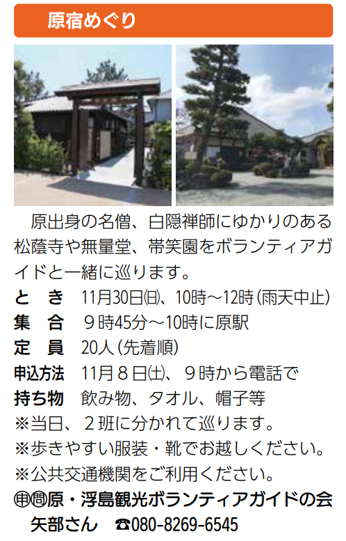 エントリーは11月8日までに原・浮島ボランティアガイドの会矢部さんまで電話で。先着20人となっていますので気になる人はお早めにどうぞ。