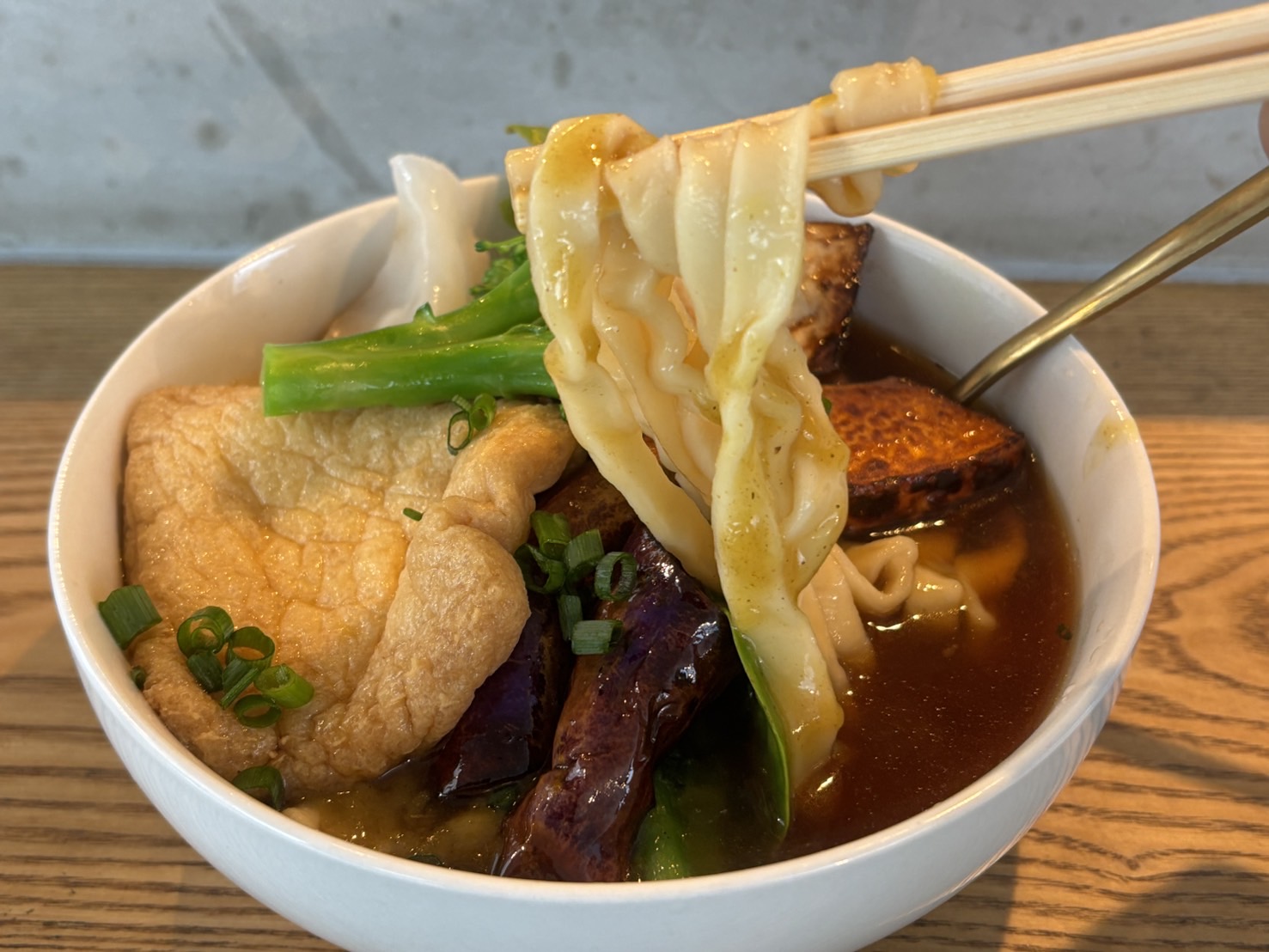 さっきパスタかと思ったうどんは、カレーをしっかりキャッチする幅広の麺になってた。うめー。