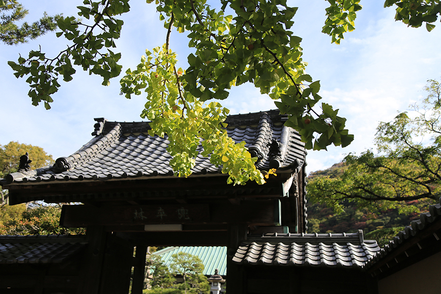 振り返って山門のほうを見れば、さきほどの大イチョウの上のほうは結構色づいてました!イチョウの木って上から色づくものなのかな?