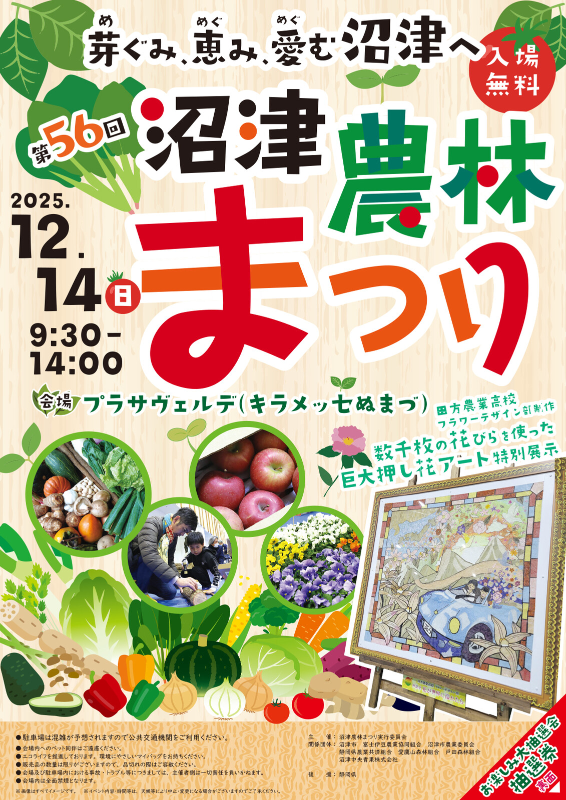 - 今年のテーマは「芽ぐみ、恵み、愛む沼津へ」。年末はキラメッセぬまづで決まり!沼津農林まつり2025は12月14日。