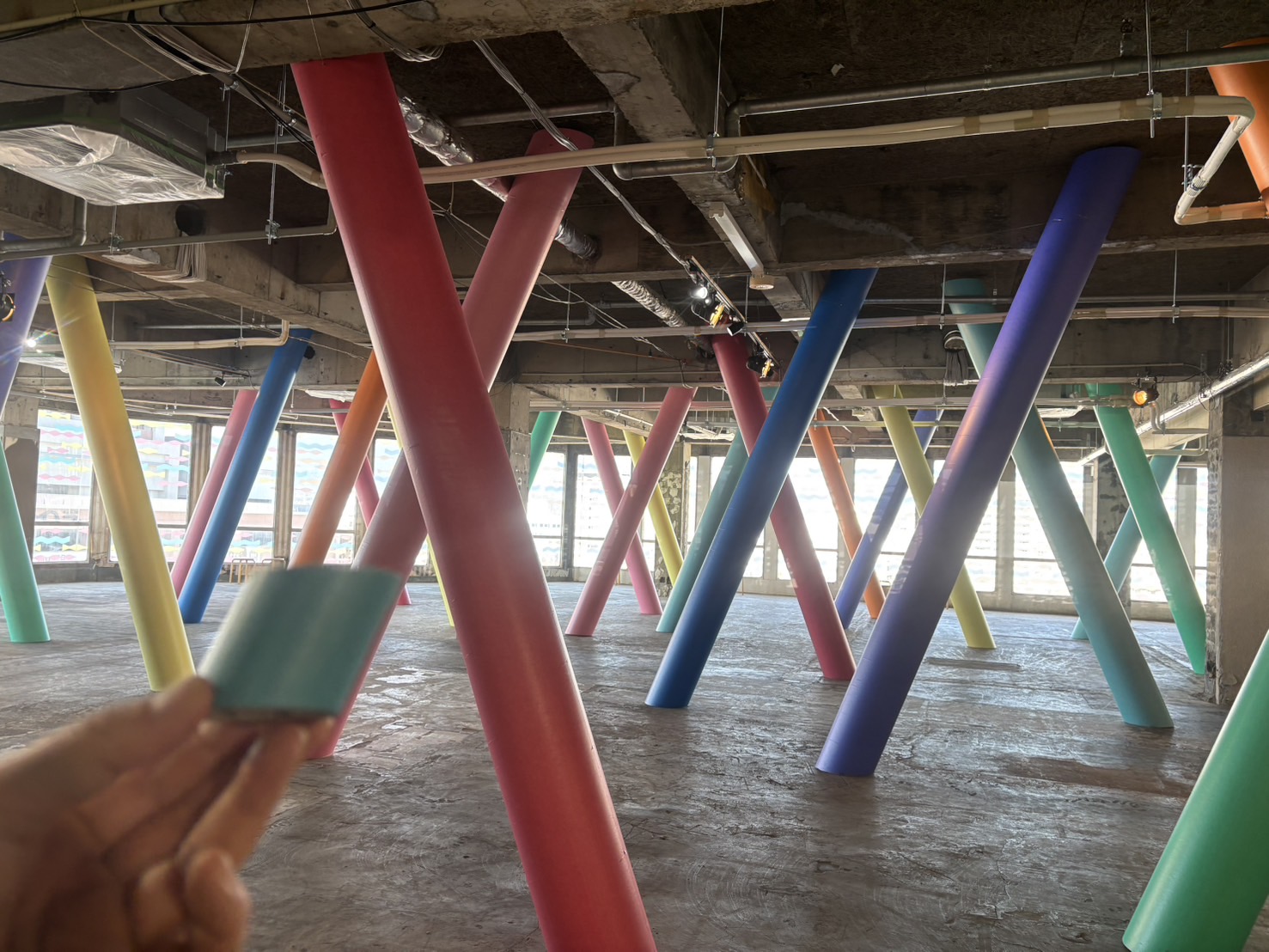 いきなり目に入ってきたこのカラフルな棒?柱?これは、マステが斜めに切られているやつをイメージしている会場装飾みたいで、