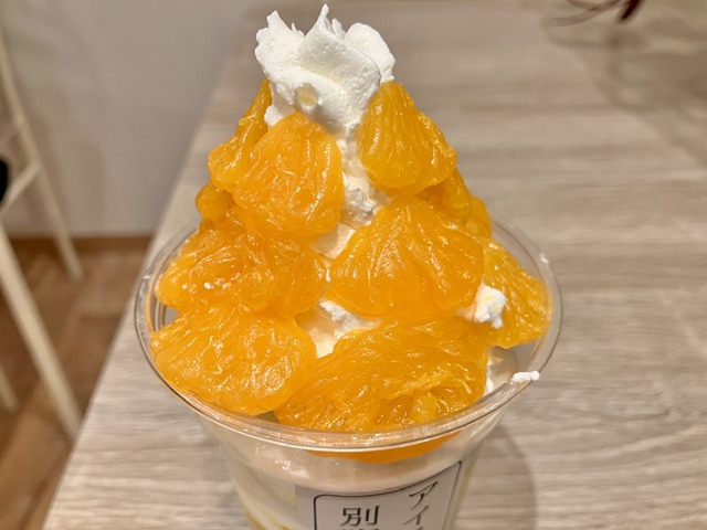 ホイップクリームの上にたっぷりみかんがトッピングされています。