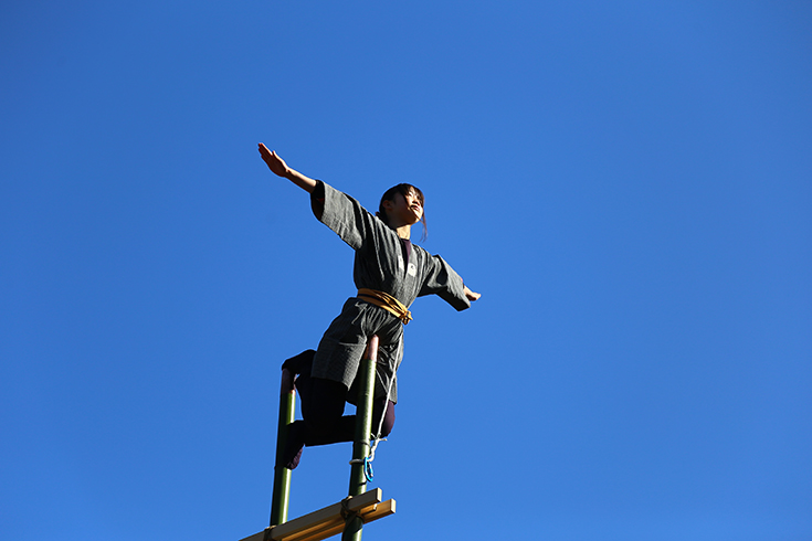 命綱的なやつはないこともないのですが、けっこうシンプルな感じで、支えているのは日頃の練習の成果と伝統の鳶職の技とプライドといったところでしょうか。ここ数年は女のコもはしごの上で華麗な技を披露してくれるのを見かけます。