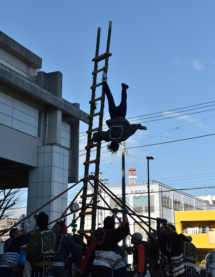 朝から夕方まで、沼津鳶職組合のみなさん(我こそは、という感じで参加してる一般の人もいるみたい)が市内各所を巡りながら、高さ約6メートルのはしごの上で、逆さまになったり、片手で止まったり、見てるこっちの足がすくむような技を次々披露してくれます。