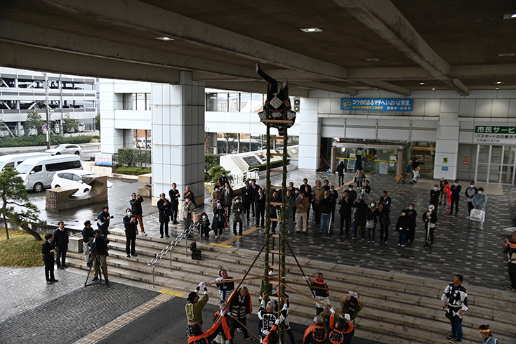 去年は天気が微妙で市役所でやったときは屋根のあるところではしごに登ってたんですよね。