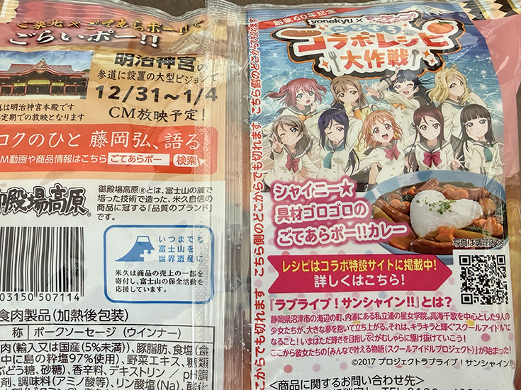 最近スーパーで見かける人は見かけてるかもしれない米久の御殿場高原あらびきポーク(通称:ごてあらポー!!)のラブライブパッケージ。ご来光とかけてごらいポー!って書いてあるしなんか縁起がいいな。