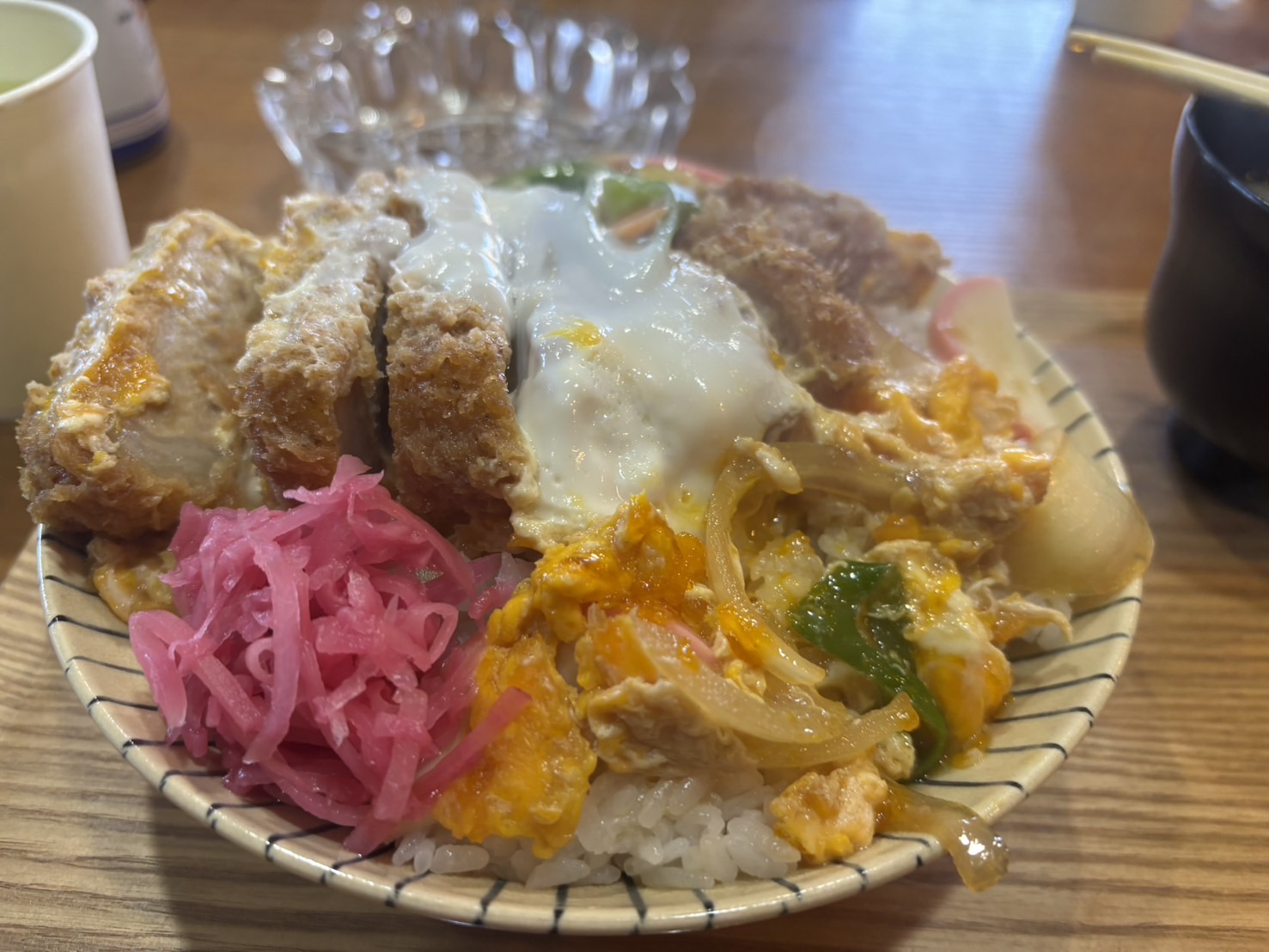 さらに。このまえ、はじめて食べたカツ丼がめっちゃボリュームあって、おいしかった♪ お肉は肉厚だし、平たいお皿だと思ったら、ご飯もずっしり。カツ丼を食べ終わったあとに、ふとカウンター上を見ると、サインが書いてあって、そのうちの一つは、天井にチョクで書いてあったので気になって「天井のサインはどなたのサインなんですか?」と、おねえさんに聞いてみたら・・・。