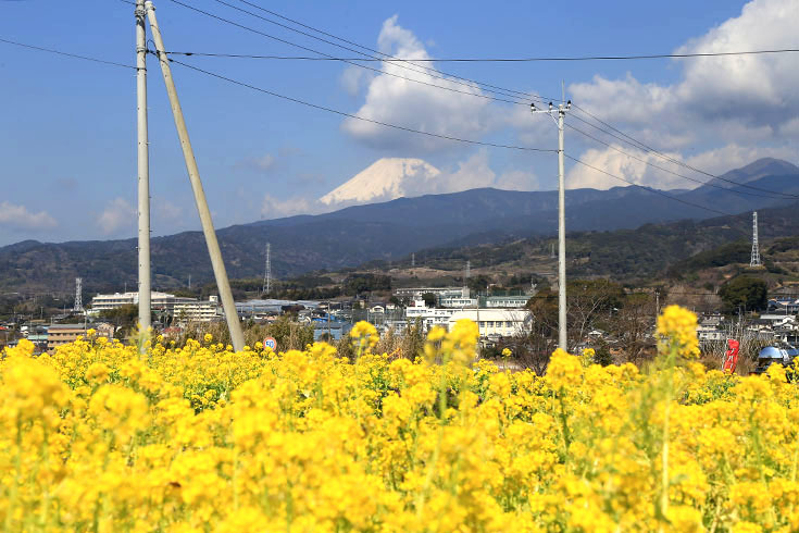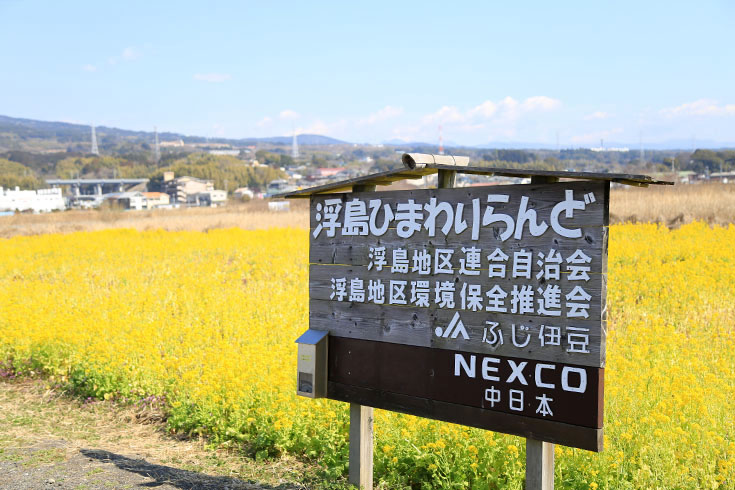 見てくださいこの感じ。一面に広がる黄色のじゅうたん。背後にはうっすら雪化粧の富士山。空はもっと青かったらよかったな。まさに浮島の春の景色って感じですね。