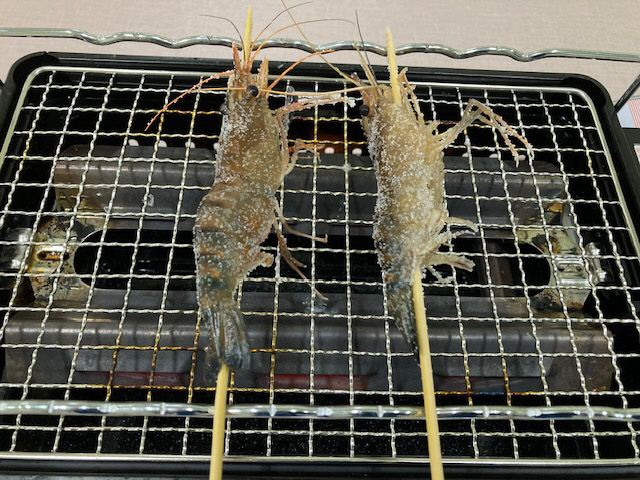 釣ったエビはその場で焼いて食べられます。