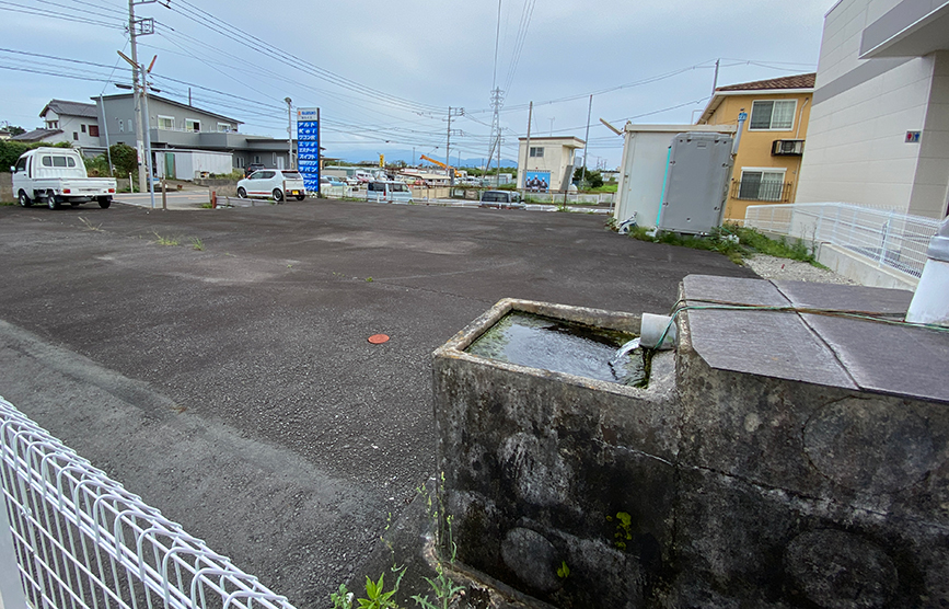 正確には地域のモータースの車置き場の敷地内にある湧水。