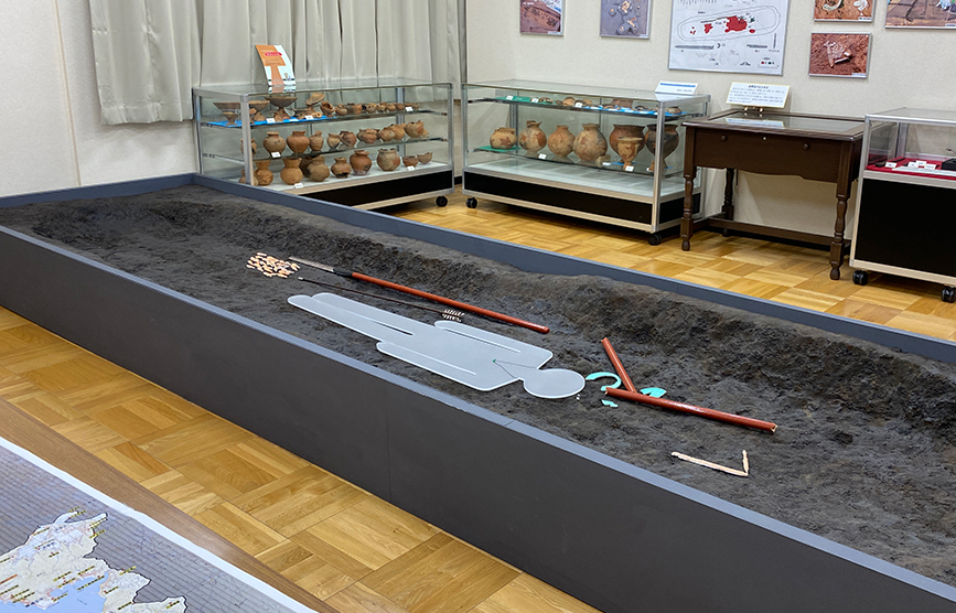 文化財センターの展示のメインは、市内でもっとも有名と言っても過言ではない「高尾山古墳」に関するもの。実際の古墳の型をとって複製したという古墳の再現。なかなかにシュールです。