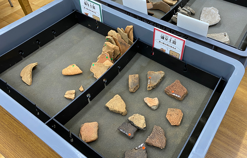 縄文土器に弥生土器!小学生のころ、社会の教科書に載ってたやつを手にとって見ることができます。