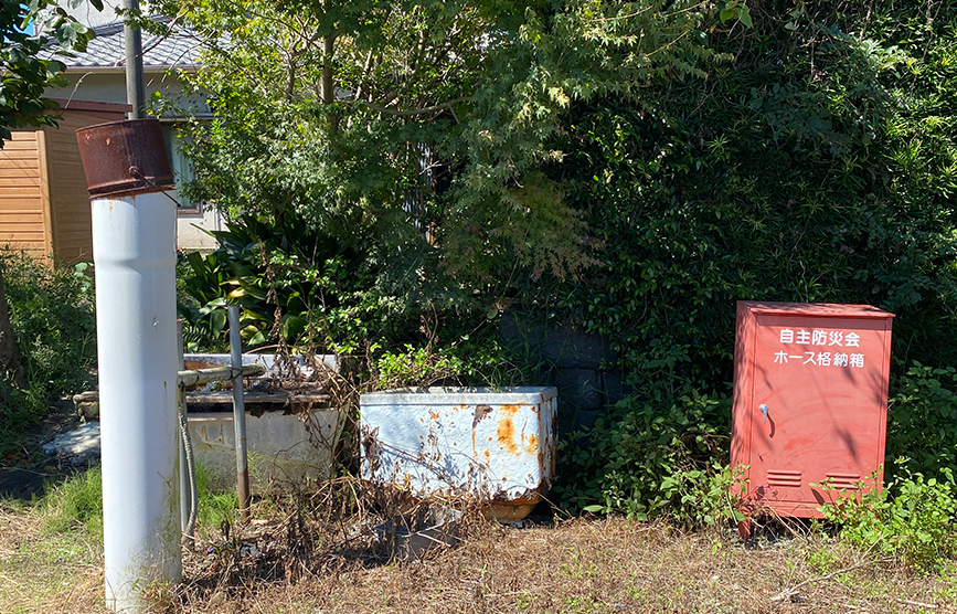 防災ホースの格納箱の並びにシンクのようなものがあり、そこにこんこんと注ぎ込んでいます。さらにその先は側溝に流れ、小さな川となって南のほうに進んでいく模様。