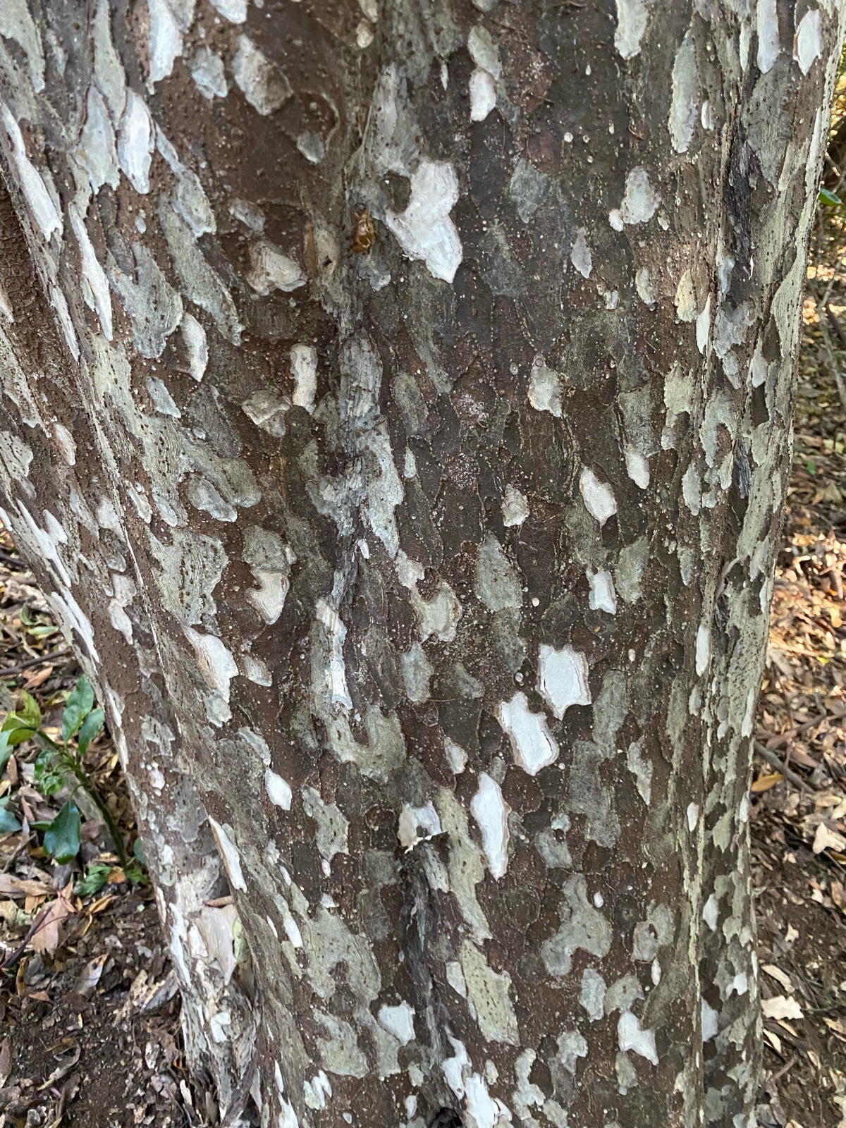 不思議な樹皮の剥がれ方をした迷彩柄のような木。