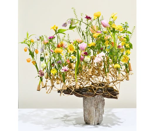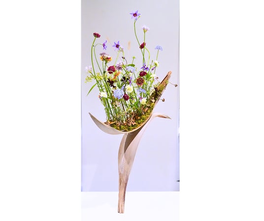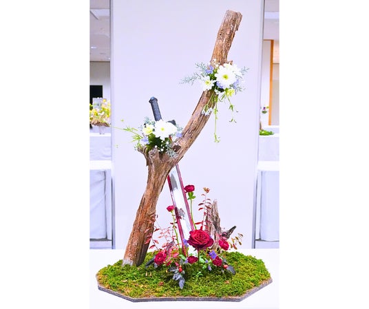 「大臣賞を受賞できたことに本当に感動しています。制作では、細い竹を古木の上に浮かせた構造に挑戦し、緊張感を保ちながらモダンな表現を追求しました。花を入れるのに苦労しましたが、それが良い経験となりました。」