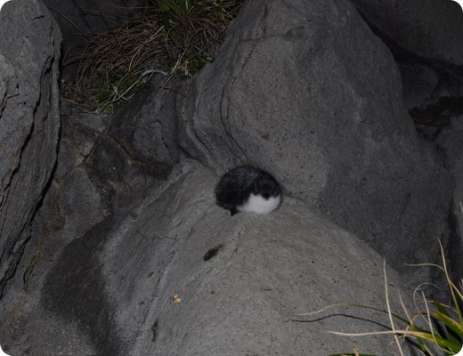 巣から海に向かうカンムリウミスズメの巣立ちビナ