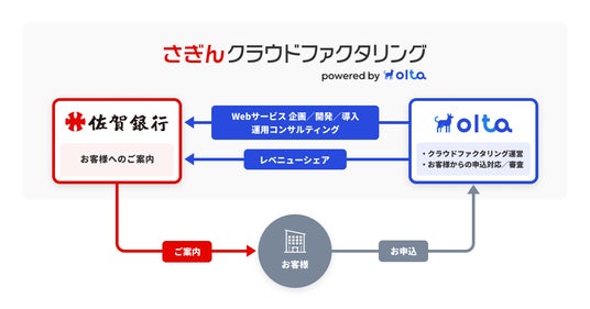 OLTAと佐賀銀行とのクラウドファクタリング事業における提携では、OLTAがWebサービスの企画・開発・導入および運用におけるコンサルティングを佐賀銀行に提供し、佐賀銀行は法人・個人事業主のお客様にサービスをご案内します。