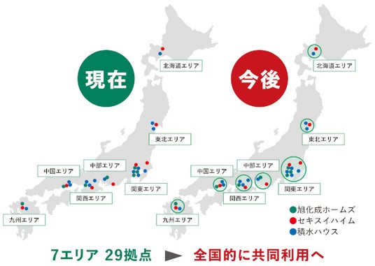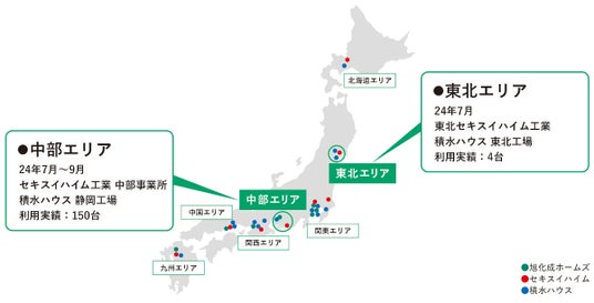 既に東北エリアで24年7月に東北セキスイハイム工業・積水ハウス東北工場の2拠点で4台、中部エリアで24年7月~9月にセキスイハイム工業中部事業所・積水ハウス静岡工場の2拠点で150台の車両の共同利用が始まっています。