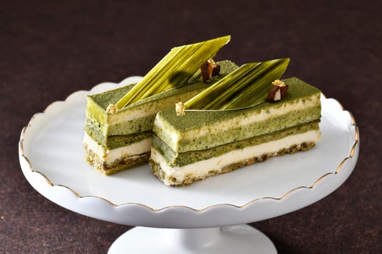 日本庭園をイメージした本商品は、2024年ジャパンケーキショー東京の受賞作品を、カットケーキとしてアレンジした限定商品です。緑茶のジョコンドを土台に、くるみやマカダミアの食感がアクセントのサクサクと香ばしいクルスティアンをのせ、ホワイトチョコムース、玉露のジュレやムースを丁寧に重ねました。一口食べると、薫り高い玉露の深い渋みや旨味が織りなす絶妙な味わいが、ほどけていくように口の中でまろやかに広がっていきます。グリーンとホワイトの美しい重なりが、新春を迎えたティータイムを色鮮やかに彩ります。この機会にぜひお召し上がりください。