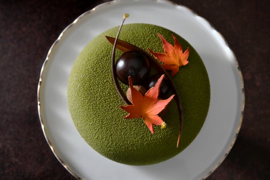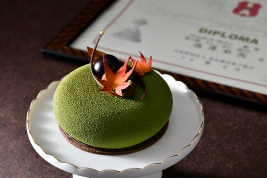 コンセプトは『日本庭園』。パティシエ塩澤が何度も試作を繰り返し完成させた「ムース・オ・テヴェール」は、コンクール開催が10月であったことから、紅葉に染まる秋の日本庭園を表現しました。“テヴェール”とはフランス語で“緑茶”の意味であり、色鮮やかな緑色が印象的な、伝統ある日本庭園を芸術的な美しさで魅了するケーキです。塩澤が静岡県出身ということもあり、小さいころから親しんできた「お茶」を主役に、茶葉を使用して創作しました。玉露の豊かな香りと深い渋みやまろやかな旨味を、玉露のムースやジュレ、ホワイトチョコムース、茶葉を使用したジョコンドなど、9層の重なる美味しさで完成させました。秋のモチーフとしてトップに飾った紅葉は、精巧な仕上がりのチョコレート細工で作られており、日本庭園の美しい彩りとして作品に華を添えます。