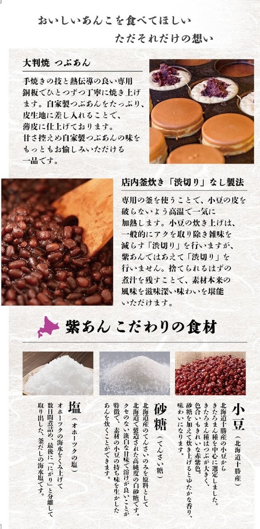 『紫あん』では、素材を厳選し、甘さを抑えつつ小豆の風味を引き立たせるため、「渋切り」をしない独自のつぶあんを店内で丁寧に炊き上げています。北海道の恵みが感じられる自家製つぶあんは保存料無添加で、やさしい味わいが特徴です。