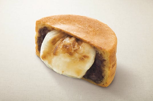 【新商品概要】大判焼「お祝い餅」直火で香ばしく焼きあげた杵つき餅は、店内で炊きあげる甘さ控えめのつぶあんと相性抜群!