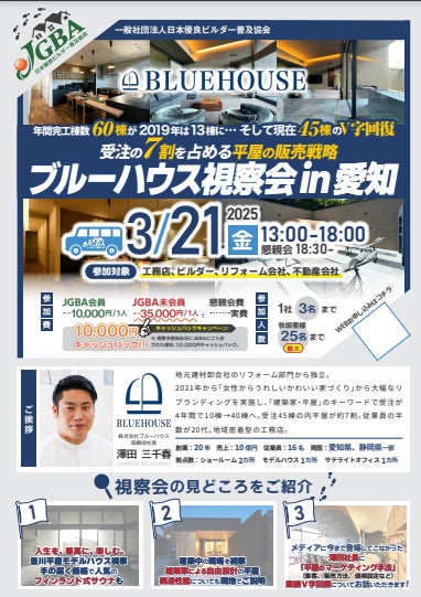 今回の視察ツアー開催企業は「人生を、最高に、楽しむ。」をブランドメッセージに掲げ、「建築家・平屋」のキーワードで4年間で30棟もの受注を伸ばした株式会社ブルーハウスで決定しており、同社の建築現場やモデルハウスといった施設を実際に視察する予定となっております。2025年3月21日(金)に開催が決定しており、会員企業に問わず全国の工務店、住宅会社が参加予定です。