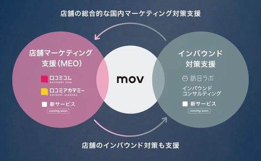 店舗向け集客一元化プラットフォーム「口コミコム」および業界最大級のインバウンドビジネスメディア「訪日ラボ」を運営する株式会社mov(代表取締役:渡邊 誠、本社:東京都渋谷区、以下mov)は、このたび株式会社日本政策金融公庫、株式会社商工組合中央金庫、株式会社みずほ銀行、株式会社静岡銀行よりシリーズBラウンドにおけるデットファイナンスを実施し、シリーズB全体をクローズしたことをお知らせいたします。