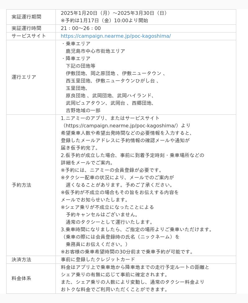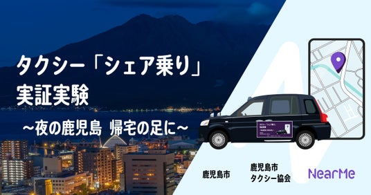 移動に関する課題解決に取り組むソーシャルデザインカンパニー、株式会社NearMe(本社:東京都中央区、代表取締役社長:高原幸一郎、以下「ニアミー」)は、鹿児島市(下鶴 隆央市長)からの委託を受けて、夜間の中心市街地エリアから周辺の住宅団地までを便利でおトクに移動できる手段としてタクシー『シェア乗り』の実証実験を2025年1月20日(月)より開始します。また、本実証実験の開始に伴い、1月17日(金)10:00よりタクシー『シェア乗り』の事前予約を開始します。
