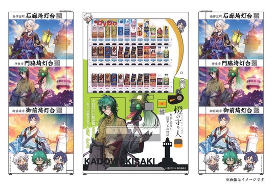 この自動販売機は、燈の守り人のキャラクター活用権を有する静岡県伊東市、および静岡県南伊豆町の地域活性化を目的としており、門脇埼灯台(静岡県伊東市)をメインに、石廊埼灯台(静岡県南伊豆町)と御前埼灯台(静岡県御前崎市)のキャラクターラッピングが施されています。さらに、金銭投入時や商品搬出時には、門脇埼灯台(CV:野津山幸宏)が「やぁ、いらっしゃい。心ゆくまで楽しんでいってネ」など、さまざまなメッセージを語りかけるおしゃべり機能を搭載。伊豆半島を訪れる方々に地域の灯台の魅力を伝え、地域活性化に貢献してまいります。