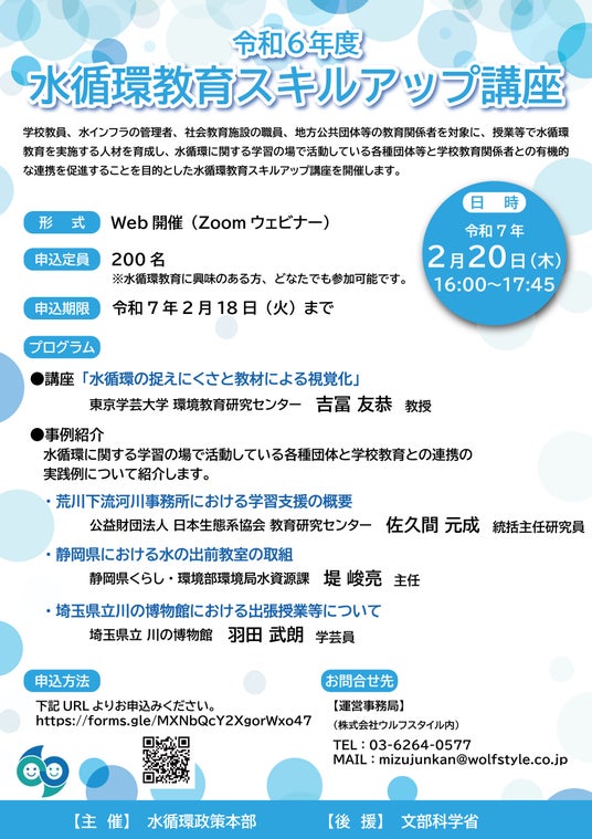 株式会社ウルフスタイル学校教員、水インフラの管理者、社会教育施設の職員、地方公共団体等の教育関係者を対象に、授業等で水循環教育を実施する人材を育成し、 水循環に関する学習の場で活動している各種団体等と学校教育関係者との有機的な連携を促進することを目的とした水循環教育スキルアップ講座を開催します。