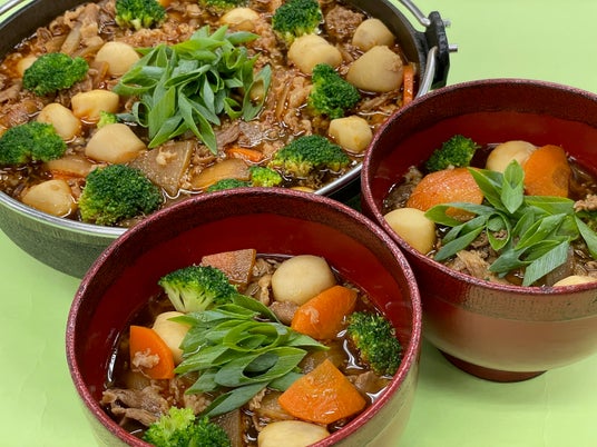 寒い季節にぴったりの「冬野菜と牛煮込みキムチ鍋」をご提供します!旨味たっぷりの牛肉に、ブロッコリー、こんにゃく、大根、ニンジン、牛房、里芋、玉ねぎなど、旬の冬野菜を贅沢に使用。ピリ辛のキムチスープが素材の美味しさを引き立てまる。