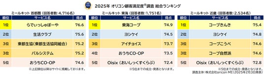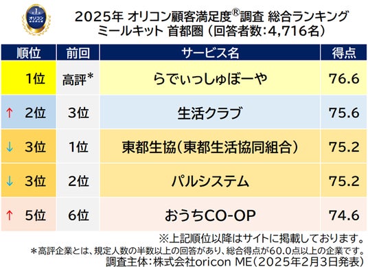 『ミールキット 首都圏』部門別ランキング(2025年 オリコン顧客満足度(R)調査)