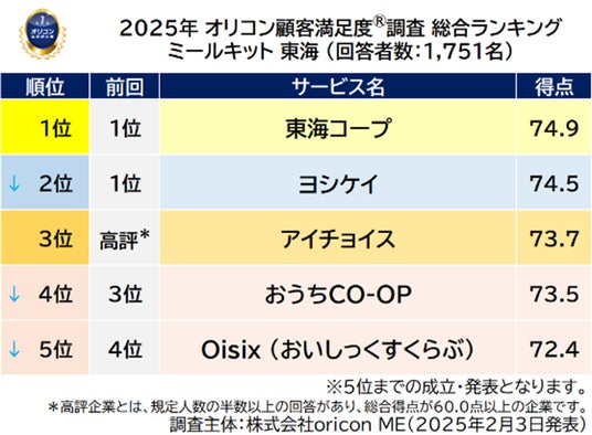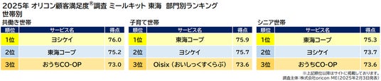 『ミールキット 東海』部門別ランキング(2025年 オリコン顧客満足度(R)調査)